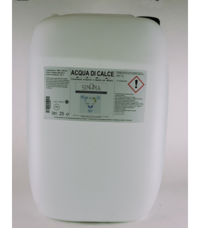 Soluzione acquosa satura di idrossido di calcio ottenuta dalla macerazione in acqua di grassello di calce puro. Naturale antibatterico, molto traspirante, resistente alla formazione di muffe e batteri, totalmente esente da additivi. Utilizzata per la preparazione di velature colorate o per il consolidamento corticale di manufatti sfarinanti.