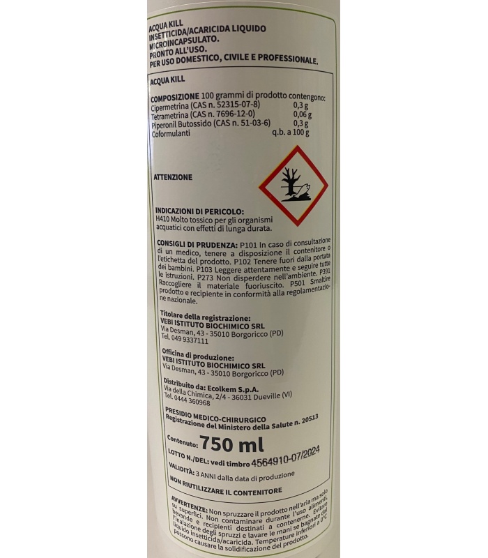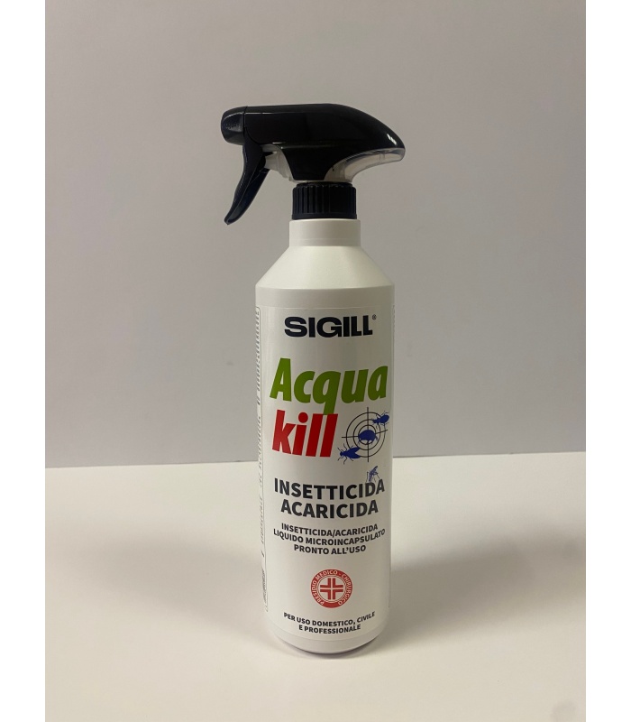 AQUA KILL è un insetticida acaricida formulato con la tecnica della macroemulsione acquosa che permette di usufruire di un contenuto di coformulati nettamente più basso rispetto ai formulati tradizionali. AQUA KILL è caratterizzato dalla rapidità della azione snidante ed abbattente per un ampio numero di infestanti: formiche, cimici, mosche, vespe, zanzare, ragni, tarme degli alimenti, tarme dei tessuti, tarli del legno, scarafaggi, pulci, zecche, tafani ed acari della polvere. Ideale per che soggiorna in camper, caravan, case mobili, bungalow e tende da campeggio. Erogabile su tutte le superfici dure, il legno e i tessuti trattabili con acqua. Prodotto inodore pronto all’uso, non macchia. Non è nocivo per cani, gatti e per nessun animale a sangue caldo. Si distingue dai comuni prodotti ad aerosol per la lunga durata della sua efficacia. Grazie alla sua formulazione AQUA KILL è esente dai rischi dei solventi organici. Non contiene gas propellenti.