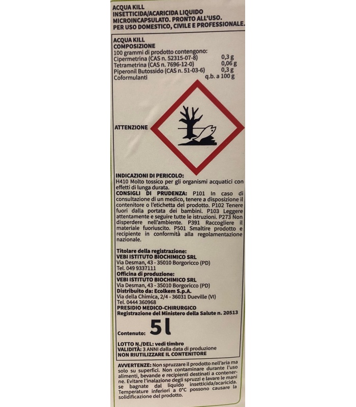 AQUA KILL è un insetticida acaricida formulato con la tecnica della macroemulsione acquosa che permette di usufruire di un contenuto di coformulati nettamente più basso rispetto ai formulati tradizionali. AQUA KILL è caratterizzato dalla rapidità della azione snidante ed abbattente per un ampio numero di infestanti: formiche, cimici, mosche, vespe, zanzare, ragni, tarme degli alimenti, tarme dei tessuti, tarli del legno, scarafaggi, pulci, zecche, tafani ed acari della polvere. Ideale per che soggiorna in camper, caravan, case mobili, bungalow e tende da campeggio. Erogabile su tutte le superfici dure, il legno e i tessuti trattabili con acqua. Prodotto inodore pronto all’uso, non macchia. Non è nocivo per cani, gatti e per nessun animale a sangue caldo. Si distingue dai comuni prodotti ad aerosol per la lunga durata della sua efficacia. Grazie alla sua formulazione AQUA KILL è esente dai rischi dei solventi organici. Non contiene gas propellenti.